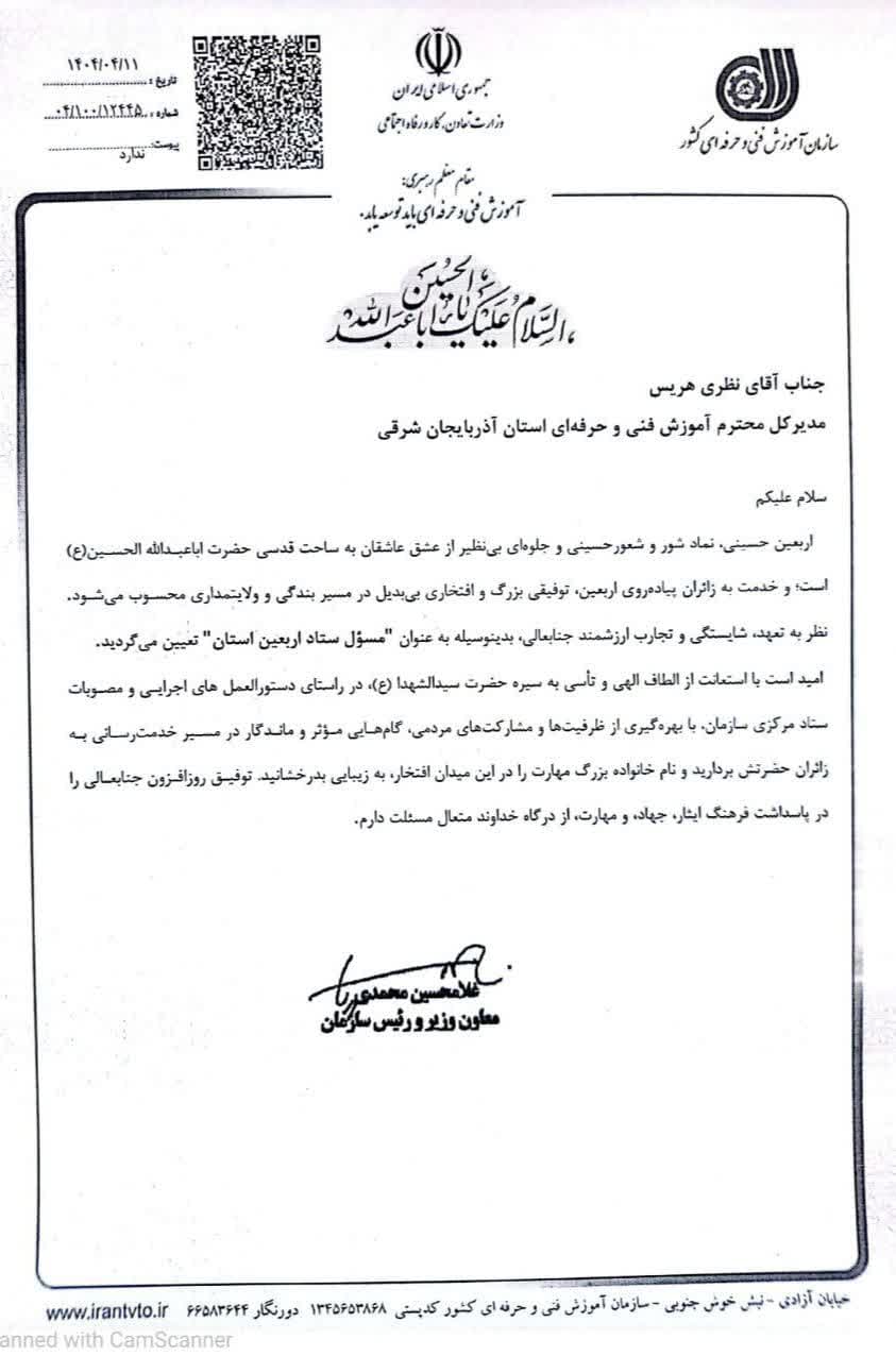 نظر به تعهد، شایستگی و تجارب ارزشمند حضرتعالی به سمت مسئول ستاد اربعین استان تعیین می شوید. امید است با استعانت از الطاف الهی و تاسی به سیره حضرت سید الشهدا(ع)، در راستای دستورالعمل های اجرایی و مصوبات ستاد مرکزی سازمان در مسیر خدمتگزاری به زائران حضرت گام های موثر و ماندگار بردارید و نام خانواده بزرگ مهارت را در این میدان افتخار، به زیبایی بدرخشانید.
